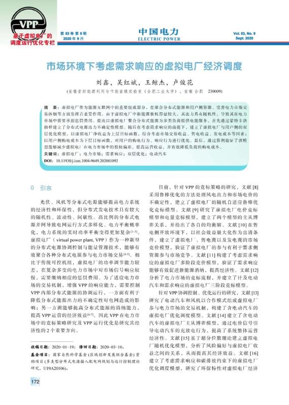 LIU Xin, WU Hongbin, WANG Jingjie, et al. Economic dispatch of a virtual power plant considering demand response in electricity market environment[J]. Electric Power, 2020, 53(9): 172-180.