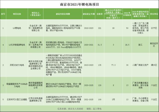 中國儲能網訊:近日,南京市發(fā)布2021年經濟社會發(fā)展重大項目計劃,5個鋰電池項目在列,建設主體包括LG化學、欣旺達、榮盛盟固利、云彩時代。
