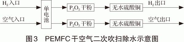 羅馬吉[28]等提出了干空氣二次吹掃除水的冷啟動(dòng)策略,同時(shí)通過實(shí)驗(yàn)得到吹掃除水后質(zhì)子交換膜燃料電池的水含量,內(nèi)阻的變化及其冷啟動(dòng)性能,干空氣二次吹掃除水系統(tǒng)如圖3所示。實(shí)驗(yàn)結(jié)果顯示,通過吹掃除水可以在較短時(shí)間內(nèi)有效除水,升高單電池內(nèi)阻,并且不會(huì)產(chǎn)生無法修復(fù)的損傷,因此,單個(gè)燃料電池從-10℃成功啟動(dòng)可以利用干空氣進(jìn)行二次吹掃除水完成。Sung Il Kim[29]等在冷啟動(dòng)過程中采用陰極側(cè)通氫的方法凈化PEMFC,實(shí)驗(yàn)結(jié)果表明,PEMFC清洗性能得到提高,加氫凈化法可以有效去除陰極的水,使PEMFC的冷啟動(dòng)性能得到改善。
