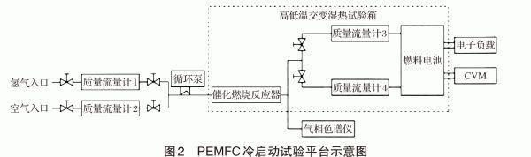 實(shí)驗(yàn)結(jié)果表明,混合氣流量增加不僅可以提高平均溫度,而且加快反應(yīng)速率 ;隨著反應(yīng)物混合氣體催化燃燒,然后利用尾氣進(jìn)行輔助供熱的低溫啟動(dòng)策略,在此基礎(chǔ)上,采用試驗(yàn)臺(tái)進(jìn)行研究,冷啟動(dòng)試驗(yàn)臺(tái)如圖2所示。實(shí)驗(yàn)結(jié)果表明,混合氣流量增加不僅可以提高平均溫度,而且加快反應(yīng)速率;隨著反應(yīng)物混合氣體中氫氣體積分?jǐn)?shù)的增加,質(zhì)子交換膜燃料電池的冷啟動(dòng)時(shí)間縮短;當(dāng)混合氣體中氫氣體積分?jǐn)?shù)是5%,氣體流量是3L/min-1時(shí),其溫度540s內(nèi)可以升高到零度以上,且燃燒反應(yīng)穩(wěn)定后再通入尾氣更利于溫度提高,滿足PEMFC的冷啟動(dòng)要求。