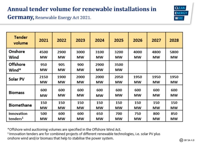 新的EEG計(jì)劃將太陽能光伏發(fā)電量提高到100吉瓦(目前約52吉瓦),陸上風(fēng)電增加到71吉瓦(目前55吉瓦),生物質(zhì)增加到8.4吉瓦,海上風(fēng)電增加到2吉瓦。每年還有額外的500-850兆瓦將通過的“創(chuàng)新競標(biāo)”進(jìn)行投標(biāo),不針對具體技術(shù),陸上風(fēng)能、太陽能光伏、生物質(zhì)和/或儲能裝置的組合將共同穩(wěn)定電力系統(tǒng)。