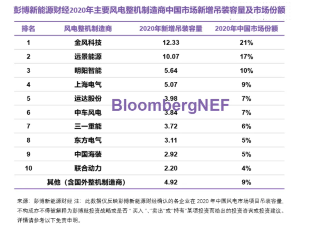 2020年中國陸上及海上風(fēng)電新增吊裝容量和市場份額相關(guān)數(shù)據(jù),彭博新能源財(cái)經(jīng)正式訂閱用戶可參見《China's Top 10 Wind Turbine Manufacturers in 2020》。