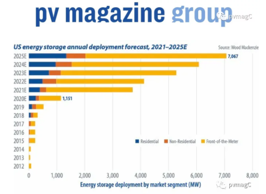 Wood Mackenzie報告稱,去年第二至三季度,美國儲能市場出現(xiàn)了240%的飆升,7月至9月期間的476兆瓦發(fā)電量創(chuàng)下了新的紀錄——這其中一半以上是由于Gateway項目。Wood-Mackenzie預計美國市場將從2020年底的逾1吉瓦增長到2025年的7.5吉瓦,漲幅為6倍。