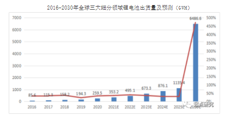 2016-2030年全球三大細(xì)分領(lǐng)域鋰電池出貨量及預(yù)測(cè)(GWH)
