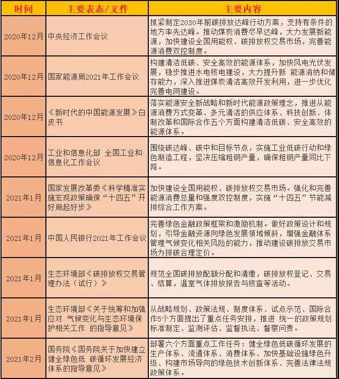 國家發(fā)展改革委、生態(tài)環(huán)境部、工信部、國家能源局、中國人民銀行等部委和單位相繼出臺文件,從發(fā)展清潔能源、完善碳排放權(quán)交易市場、壓縮粗鋼產(chǎn)量、落實總量和強度雙控制度、建立綠色金融政策框架等方面引導(dǎo)碳達峰、碳中和工作開展(詳見表1)。