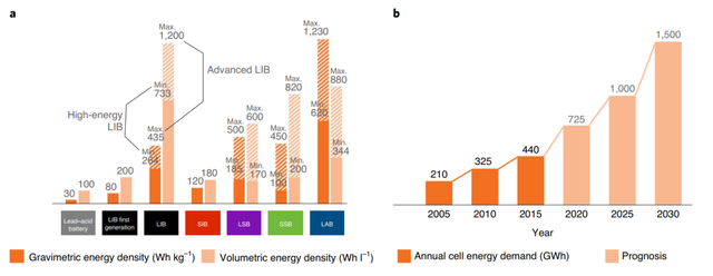 鋰離子電池經(jīng)過三十年的發(fā)展,在技術(shù)上得到了長足的發(fā)展,成本大幅降低,2019年鋰離子電池的產(chǎn)能已經(jīng)達(dá)到160GWh/年,并且預(yù)計(jì)到2030年將進(jìn)一步增加至1500GWh/年。