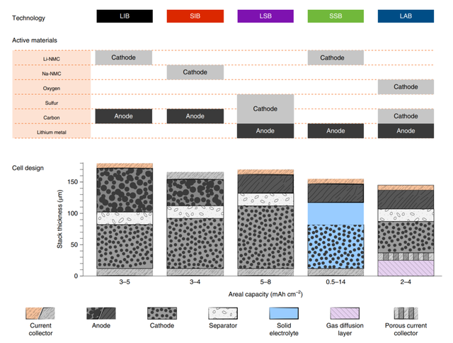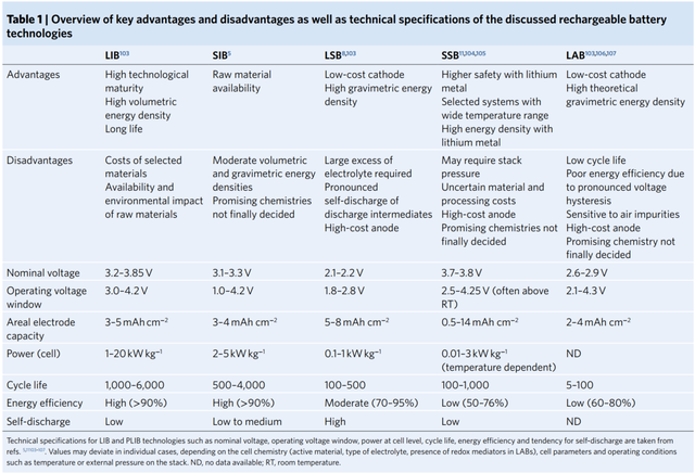 近年來為了滿足對(duì)于高能量密度的進(jìn)一步需求,人們開發(fā)了多種新型的儲(chǔ)能電池,這些電池能量密度最高可達(dá)1200Wh/kg以上,體積能量密度可達(dá)800Wh/L以上,同時(shí)這些電池還通過采用低成本的原材料(如Na、S和O等)獲得了低成本的優(yōu)勢,下表中作者對(duì)比了主要的幾種新型儲(chǔ)能電池的優(yōu)劣勢。