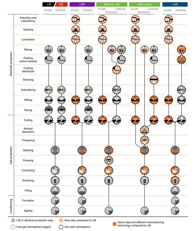 除了上述電池體系上的區(qū)別,作者還對(duì)幾種電池生產(chǎn)過程進(jìn)行了對(duì)比,由于采用了新的體系和材料,因此在生產(chǎn)工藝上也需要進(jìn)行較多的調(diào)整。作者將整個(gè)生產(chǎn)過程分為了三個(gè)大的過程:1)電極制備;2)電池生產(chǎn);3)化成。