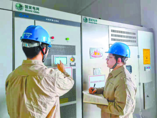 為確保項目可行性,攻關(guān)團(tuán)隊先在實驗室完成50千瓦樣機(jī)各項功能試驗后,再進(jìn)行500千瓦超級電容微儲能裝置的研制。該裝置主要由超級電容模塊、電力電子變流器和快速功率控制器三部分組成??焖俟β士刂破骺稍?0毫秒內(nèi)完成頻率檢測,電力電子變流器可在2毫秒內(nèi)實現(xiàn)有功功率的快速、精準(zhǔn)支撐,并且電力電子變流器集成了電網(wǎng)諧波主動抑制、無功功率靈活調(diào)節(jié)功能,讓該裝置成為集儲能與電能質(zhì)量管理于一體的新型補(bǔ)償裝置。今年2月7日,這套變電站超級電容微儲能裝置投入使用。