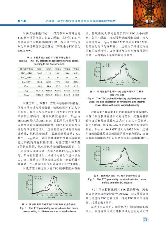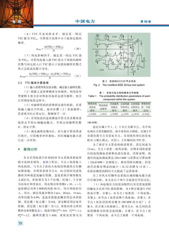 結(jié)論:針對 “風(fēng)火打捆 ”交直流外送這一新型的輸電系統(tǒng),采用改進(jìn)的連續(xù)潮流算法完成了區(qū)域間輸電能力單一樣板值的計(jì)算,在保證精度的同時(shí)大大提高了計(jì)算效率;隨后綜合考慮風(fēng)電波動(dòng)以及系統(tǒng)各種不確定因素,采用非序貫蒙特卡洛仿真法對區(qū)域間TTC進(jìn)行概率評估,得到了一系列的概率評估指標(biāo),分析了風(fēng)電出力波動(dòng)性、交直流混聯(lián)輸電方式以及風(fēng)火打捆比例等對區(qū)域間輸電能力的影響規(guī)律,對未來實(shí)際系統(tǒng)的運(yùn)行具有一定的參考意義。
