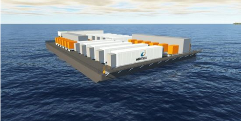 瓦錫蘭浮動(dòng)駁船電池儲(chǔ)能解決方案渲染圖,部署的54MW/32MWh儲(chǔ)能系統(tǒng)將為電力駁船的柴油發(fā)電平臺(tái)提供輔助服務(wù)