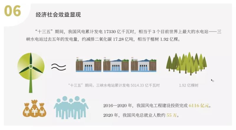 “十三五”期間,我國風電累計發(fā)電17330 億千瓦時,相當于3 個目前世界上最大的水電站——三峽水電站過去五年的發(fā)電量,約減排二氧化碳17.28 億噸,相當于植樹1.92 億棵。2016―2020 年,我國風電工程建設(shè)投資完成6116 億元。2020 年,我國風電總就業(yè)人數(shù)約55 萬。