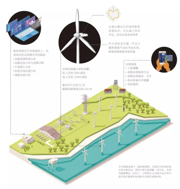 風電機組:最大單機容量:陸上達到5MW 級別,海上達到11MW 級別;最長葉片達到91 米,最高輪轂高度達到160 米。