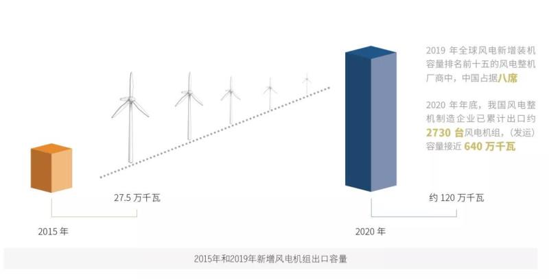 2019 年全球風電新增裝機容量排名前十五的風電整機廠商中,中國占據(jù)八席。2020 年年底,我國風電整機制造企業(yè)已累計出口約2730 臺風電機組,(發(fā)運)容量接近640 萬千瓦。