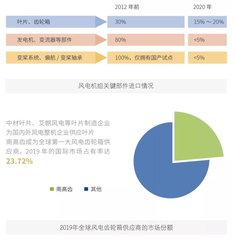中材葉片、艾朗風電等葉片制造企業(yè)為國內(nèi)外風電整機企業(yè)供應葉片。南高齒成為全球第一大風電齒輪箱供應商,2019 年的國際市場占有率達23.72%。