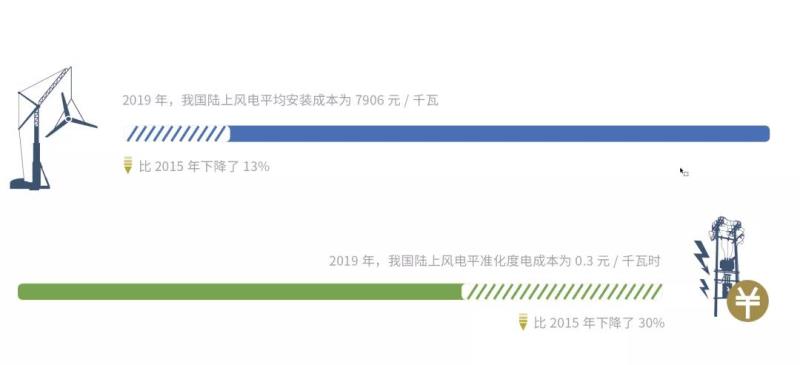 2019 年,我國陸上風電平均安裝成本為7906 元/ 千瓦,比2015 年下降了13%。2019 年,我國陸上風電平準化度電成本為0.3 元/ 千瓦時,比2015 年下降了30%。