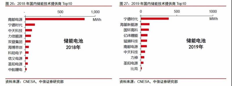 對比2018-2019年中國儲能技術(shù)提供商(即電池提供商)Top10企業(yè)的變化即可看到,寧德時代、國軒高科、億緯鋰能等國內(nèi)動力電池領(lǐng)先企業(yè),儲能裝機量均在2019年取得了明顯的同比增長。