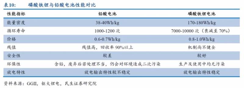磷酸鐵鋰電池能量密度可達鉛酸電池的4-5倍,且在安全性、循環(huán)壽命、快速充放性能等方面優(yōu)勢明顯。盡管目前磷酸鐵鋰電池價格仍高于鉛酸電池,但在全生命周期成本評價體系下,由于擁有更長的循環(huán)壽命,磷酸鐵鋰電池已幾乎抹平了成本劣勢,且未來幾年仍有降本空間。