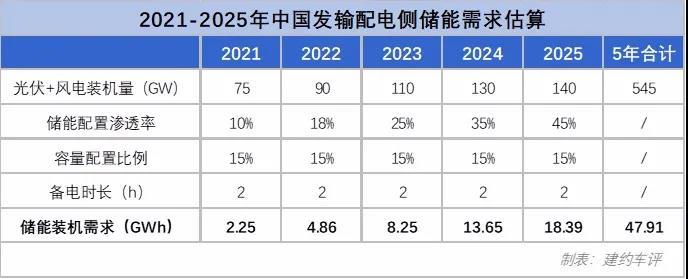 以光伏+風(fēng)電裝機增量為測算依據(jù),并考慮儲能配置滲透率逐漸提升,容量配置比例取15%,容量時長取2小時,預(yù)計我國2021-2025年發(fā)輸配電側(cè)(即電表前端)的儲能裝機需求約為48GWh。