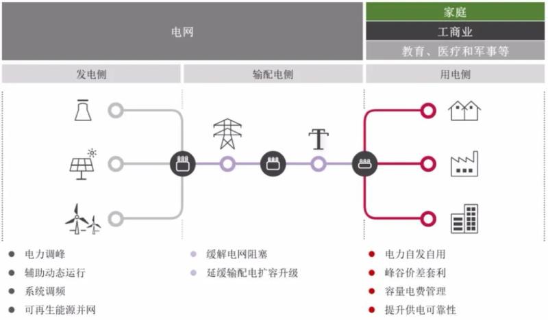 作為平衡整個電力系統(tǒng)供需關(guān)系的設(shè)備和措施,儲能在發(fā)電側(cè)和輸配電側(cè)的本質(zhì)作用是相同的。儲能布設(shè)在哪個階段,主要涉及的是利益分配問題。因此,國外機構(gòu)通常將發(fā)電側(cè)和輸配電側(cè)儲能統(tǒng)一歸類為“電表前端儲能”。