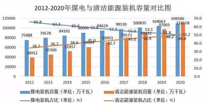 值得注意的是,在連續(xù)多年的清潔發(fā)電高速增長和煤電緩增長后,2020年底,中國煤電總裝機容量占比首次下降到50%以下。