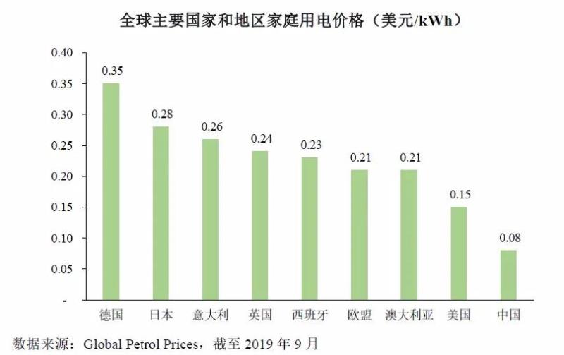 與中國相比,一些發(fā)達國家的居民用電成本高昂。根據(jù)Global Petrol Prices數(shù)據(jù),德國、日本、英國、澳大利亞和美國的居民用電均價分別為0.38、0.29、0.26、0.25和0.15美元/kWh,而中國民用電價僅為0.08美元/kWh。