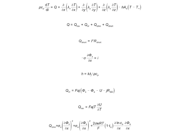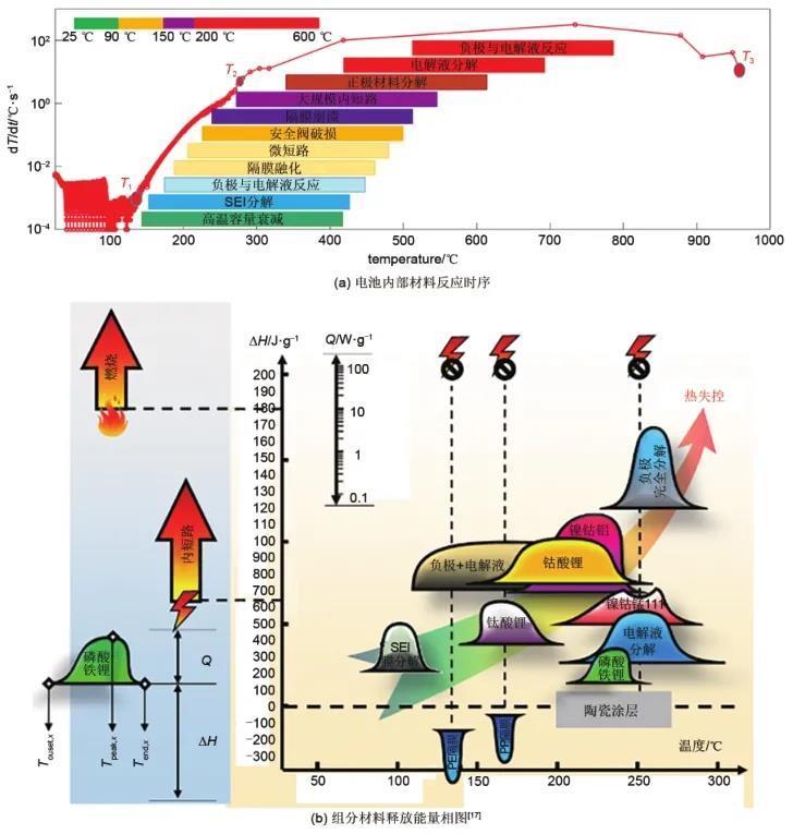 電池動(dòng)力系統(tǒng)中,電池單體在不同運(yùn)行工況、充放電的過程中會(huì)存在單體內(nèi)阻不一致的情況。內(nèi)阻不一致導(dǎo)致產(chǎn)熱不一致,進(jìn)而電池動(dòng)力系統(tǒng)表現(xiàn)出溫度的不均一性。此外,單體與單體連接、模組與模組連接元件之間存在接觸電阻,當(dāng)連接元件出現(xiàn)松動(dòng)時(shí),可能造成局部接觸電阻增大,當(dāng)大電流通過接觸熱阻時(shí)出現(xiàn)局部過熱的危險(xiǎn)問題。如2008年改裝Prius HEV高速公路汽車著火事故,原因就是裝配失誤導(dǎo)致行駛過程中電池組接頭松動(dòng)而出現(xiàn)接觸電阻增大,脈沖電流加劇了接頭處的異常生熱,導(dǎo)致附近電池在熱濫用的情況下異常生熱而發(fā)生熱失控。鋰離子電池在熱濫用觸發(fā)熱失控的過程中,從低溫到高溫會(huì)依次經(jīng)歷:高溫容量衰減、SEI膜分解、負(fù)極與電解液反應(yīng)、隔膜熔化、正極分解反應(yīng)、電解液分解反應(yīng)、負(fù)極與黏結(jié)劑反應(yīng)、電解液燃燒等過程。圖8(a)展示了一個(gè)基于加速量熱儀ARC和差示掃描量熱儀DSC測(cè)試結(jié)果的熱失控過程。圖中T1點(diǎn)對(duì)應(yīng)著SEI的分解;T2對(duì)應(yīng)著電池內(nèi)部劇烈氧化還原反應(yīng)和內(nèi)短路;T3與T1的溫差可表征熱失控反應(yīng)生成焓?H。當(dāng)電池內(nèi)部溫度達(dá)到熱失控觸發(fā)溫度T2時(shí),溫升速率dT/dt會(huì)發(fā)生劇烈變化。圖8(b)中組分材料能量釋放相圖是基于恒速率溫度掃描情況下得到的各類電池材料放熱曲線,反映了不同體系電池內(nèi)部材料在熱失控過程中的能量釋放規(guī)律及動(dòng)力學(xué)特征,相圖中的橫坐標(biāo)代表了組分材料發(fā)生反應(yīng)時(shí)的溫度,主要指反應(yīng)的起始溫度Tonset,峰值溫度Tpeak,反應(yīng)結(jié)束溫度Tend。相圖中山丘形狀表示組分材料反應(yīng)的放熱速率,山丘越陡峭,表征該材料放熱速率越大,山丘的山腳所處的高度代表反應(yīng)的生成焓?H,山丘的高度代表反應(yīng)放熱的峰值功率Q。