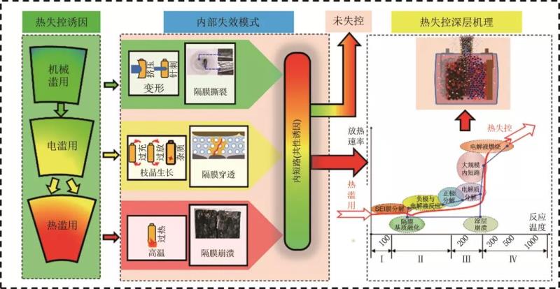 內(nèi)短路是熱失控誘因的一個(gè)共性環(huán)節(jié),因?yàn)闊o論是機(jī)械濫用、電濫用還是熱濫用,在熱失控過程中都會(huì)經(jīng)歷內(nèi)短路過程。鋰離子電池內(nèi)短路是指電池隔膜失效時(shí),正負(fù)極活性物質(zhì)接觸,在電勢(shì)差驅(qū)動(dòng)下產(chǎn)生劇烈放電和產(chǎn)熱的現(xiàn)象。圖9說明了電池內(nèi)短路在受到機(jī)械濫用、電濫用、熱濫用的情況下,與熱失控發(fā)生發(fā)展過程的相互關(guān)系。從圖中可以看出,機(jī)械碰撞或者針刺導(dǎo)致電池變形,撕裂隔膜導(dǎo)致內(nèi)短路;鋰電池在過充、過放或者隔膜表面引入雜質(zhì)都可能誘發(fā)電池內(nèi)部的枝晶生長(zhǎng),枝晶可能穿過隔膜孔隙造成內(nèi)短路。當(dāng)出現(xiàn)隔膜撕裂破損時(shí),電池內(nèi)部正負(fù)極材料連通,此時(shí)機(jī)械濫用演變?yōu)殡姙E用,電濫用發(fā)生時(shí),電池內(nèi)部發(fā)生大規(guī)模內(nèi)短路,內(nèi)短路會(huì)產(chǎn)生大量焦耳熱,此時(shí)電濫用演變?yōu)闊釣E用。當(dāng)電池系統(tǒng)的散熱速率小于產(chǎn)熱速率時(shí),內(nèi)短路產(chǎn)生的焦耳熱不斷在電池內(nèi)部累積,一旦達(dá)到熱失控觸發(fā)溫度T2,電池?zé)崾Э鼐蜁?huì)發(fā)生。鋰離子電池發(fā)生熱失控的過程中,電池內(nèi)部組分材料會(huì)形成一個(gè)“受熱→溫升→反應(yīng)”的閉環(huán),在溫度過高的情況下,該閉環(huán)失去控制,電池內(nèi)部?jī)?chǔ)存的化學(xué)能全部通過熱的形式釋放出來。然而,還有一種電池內(nèi)短路只會(huì)出現(xiàn)明顯的自放電現(xiàn)象,不會(huì)觸發(fā)熱失控。內(nèi)短路以及三種熱失控誘因之間互相耦合、協(xié)同發(fā)展,需要注意的是,近年的研究表明,電池內(nèi)短路和熱失控并不是等價(jià)的物理現(xiàn)象。