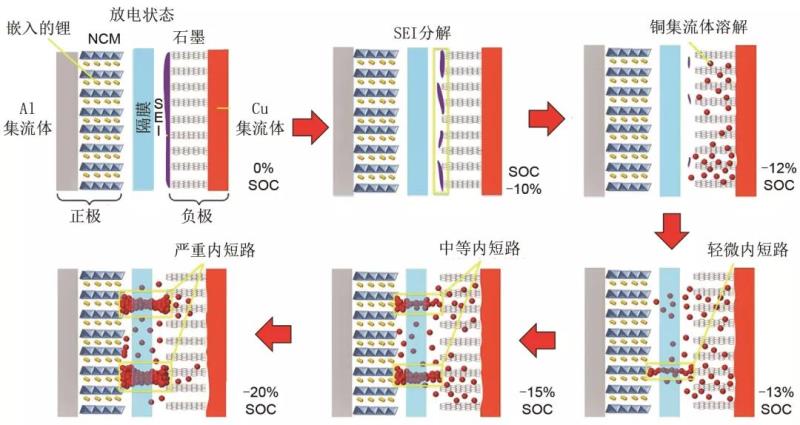 過放電觸發(fā)電池?zé)崾Э貦C(jī)理與過充電不同,過放電有可能引發(fā)內(nèi)短路。對(duì)于串聯(lián)電池模組,過放電還會(huì)導(dǎo)致電池電壓變?yōu)樨?fù)值。鋰離子電池過放電會(huì)導(dǎo)致鋰離子不斷從負(fù)極脫離并嵌入正極,表現(xiàn)為負(fù)極電位不斷升高,正極電位不斷降低,當(dāng)負(fù)極電位達(dá)到3.4 V左右時(shí),負(fù)極銅集流體開始腐蝕,此時(shí)負(fù)極電位進(jìn)入電化學(xué)反應(yīng)平臺(tái),并伴隨著銅集流體溶解;溶解的銅離子通過隔膜進(jìn)入正極并在正極沉淀,正極電位在沉淀銅離子還原作用下出現(xiàn)電位上升的現(xiàn)象。隨著銅集流體不斷溶解和沉淀的電化學(xué)反應(yīng)不斷進(jìn)行,電池內(nèi)短路現(xiàn)象愈發(fā)嚴(yán)重,當(dāng)內(nèi)短路達(dá)到一定程度時(shí),電池?zé)崾Э鼐蜁?huì)發(fā)生。圖7說明了過放電時(shí),銅的溶解過程以及過放電誘發(fā)內(nèi)短路形成機(jī)理。電池過放電至SOC<-12%時(shí),就會(huì)出現(xiàn)銅沉積現(xiàn)象,進(jìn)而誘發(fā)電池內(nèi)短路發(fā)生;隨著過放電程度的不斷加深,內(nèi)短路程度越來越嚴(yán)重。