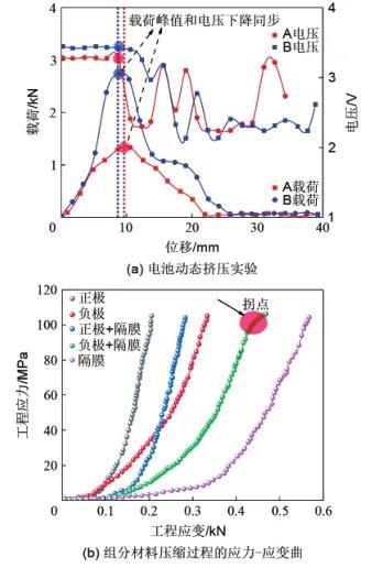機(jī)械誘因是指車輛發(fā)生碰撞導(dǎo)致電池系統(tǒng)、模組或者電池單體發(fā)生機(jī)械變形,以及隨之出現(xiàn)的擠壓或者針刺情況,機(jī)械濫用導(dǎo)致電動(dòng)汽車發(fā)生事故的本質(zhì)是由于電池包承受擠壓載荷下的結(jié)構(gòu)失效行為。在實(shí)際車輛碰撞中,電池包內(nèi)電池承受的載荷具有一定的隨機(jī)性和復(fù)雜性。不過,電池單體在電池包的約束下,承受主要的載荷加載形式即為擠壓載荷。通過電池單體機(jī)械穿孔實(shí)驗(yàn)可發(fā)現(xiàn),電池在擠壓載荷的作用下,電池內(nèi)部隔膜會(huì)出現(xiàn)斷裂,侵入的物體或者隔膜破損處形成了電流回路,電池單體電壓表現(xiàn)出電壓下降的特征。圖5(a)中,在擠壓載荷的作用下,電池載荷-位移曲線上出現(xiàn)的峰值對(duì)應(yīng)著電池內(nèi)部極片的斷裂和隔膜的斷裂;AB電池樣品載荷-位移曲線峰值處,電池電壓均會(huì)表現(xiàn)出明顯的電壓降,此時(shí)電池內(nèi)短路已經(jīng)初步形成。在整個(gè)機(jī)械載荷作用下,電池內(nèi)部材料由于壓實(shí)作用會(huì)依次經(jīng)歷剛度增加、剛度增加停止且活性材料出現(xiàn)裂紋、隔膜顆粒擠入負(fù)極石墨顆粒間隙、活性物質(zhì)剪切失效、涂層與集流體分離、內(nèi)短路形成等過程;在整個(gè)擠壓過程中,電池內(nèi)部材料應(yīng)力響應(yīng)出現(xiàn)的拐點(diǎn)代表電池內(nèi)部損傷的臨界點(diǎn),如圖5(b)所示。電動(dòng)汽車在碰撞過程中,電池包約束結(jié)構(gòu)發(fā)生損壞,單體則會(huì)在擠壓載荷的作用下發(fā)生明顯的機(jī)械形變。機(jī)械形變會(huì)導(dǎo)致電池內(nèi)部隔膜撕裂、破損,造成電池內(nèi)部材料正負(fù)極接觸,進(jìn)而發(fā)生內(nèi)短路。此外,車輛碰撞還會(huì)導(dǎo)致電池單體外殼變形破損,從而引起電解液泄漏,泄漏的電解液又會(huì)加大電池系統(tǒng)發(fā)生外短路的風(fēng)險(xiǎn)。