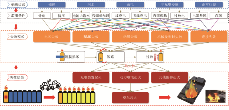 通過對(duì)電動(dòng)汽車不同狀態(tài)下的事故進(jìn)行深度分析,可以將電動(dòng)汽車事故的失效模式歸納為電芯失效、電池管理系統(tǒng)(BMS,battery management system)失效、絕緣失效、機(jī)械及密封失效、連接失效等;按照發(fā)生事故時(shí)車輛所處的狀態(tài)可以歸納為碰撞、泡水、充電、靜置自燃、行駛中自燃等。車輛發(fā)生碰撞引起車輛局部發(fā)生類似針刺或者擠壓效應(yīng),進(jìn)而引起車輛動(dòng)力系統(tǒng)發(fā)生電芯失效、絕緣失效或者機(jī)械失效等;車輛泡水會(huì)引起動(dòng)力系統(tǒng)中電池發(fā)生內(nèi)短路或者外短路,進(jìn)而引發(fā)電芯失效或者絕緣失效;車輛充電時(shí)出現(xiàn)的過充或者飛線充電導(dǎo)致的連接失效都會(huì)導(dǎo)致電芯失效;車輛靜置時(shí)出現(xiàn)的內(nèi)部損耗和過放電會(huì)引起電芯失效和機(jī)械及密封失效;非法改裝或者電氣故障會(huì)導(dǎo)致車輛正常行駛過程中出現(xiàn)BMS失效及連接失效,進(jìn)而引發(fā)事故。圖4展示了電動(dòng)汽車事故誘發(fā)原因之間的邏輯關(guān)系。圖中可以看出:電動(dòng)汽車事故出現(xiàn)的失效模式都可以歸納為機(jī)械濫用導(dǎo)致隔膜破損、電濫用觸發(fā)的內(nèi)部或者外部短路、局部過熱引起充電裝置、電池單體或者附件著火等。首先失效的單體發(fā)生熱失控會(huì)瞬間釋放大量的能量,表現(xiàn)為噴出高溫?zé)煔?、火星、電解液等,失效電池?duì)周圍電池劇烈傳熱的同時(shí),噴出的電解液又會(huì)加速熱失控蔓延的發(fā)生。當(dāng)周圍電池達(dá)到熱失控觸發(fā)溫度時(shí),熱失控蔓延就會(huì)發(fā)生,進(jìn)而蔓延至整個(gè)動(dòng)力電池系統(tǒng),最后表現(xiàn)為整車的燃燒或者爆炸。