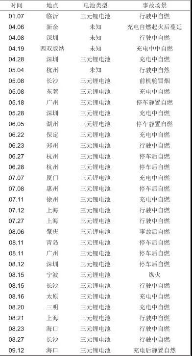 表1詳細(xì)列舉了2020年20起事故發(fā)生的時(shí)間、地點(diǎn)、電池類型以及可能的事故原因。表中可以看出32起事故中發(fā)生在夏季,占68%。清華大學(xué)電池安全實(shí)驗(yàn)室發(fā)布的《2019動(dòng)力電池安全性研究報(bào)告》對(duì)電動(dòng)汽車發(fā)生事故集中批次進(jìn)行統(tǒng)計(jì)分析發(fā)現(xiàn):電動(dòng)汽車事故多發(fā)生在出廠后的第2年夏天,提示了環(huán)境溫度的升高與電動(dòng)汽車發(fā)生事故概率可能存在正相關(guān)的關(guān)系。并且,車輛研發(fā)驗(yàn)證周期大約在一年以內(nèi),一年之后可能有新的失效原因呈現(xiàn)出來。