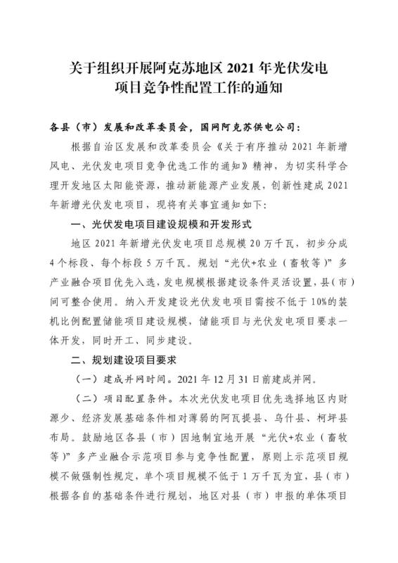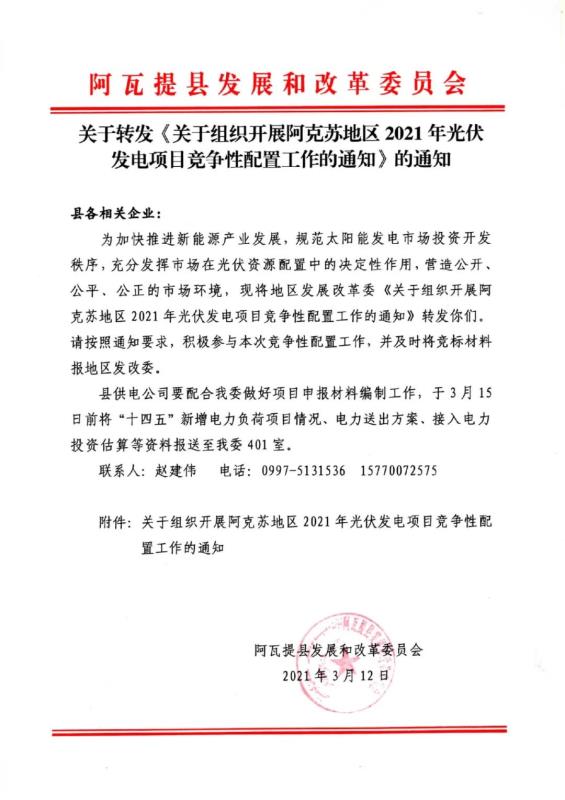 中國儲(chǔ)能網(wǎng)訊:近日,阿瓦提縣發(fā)改委轉(zhuǎn)發(fā)了《關(guān)于組織開展阿克蘇地區(qū)2021年光伏發(fā)電項(xiàng)目競爭性配置工作的通知》。
