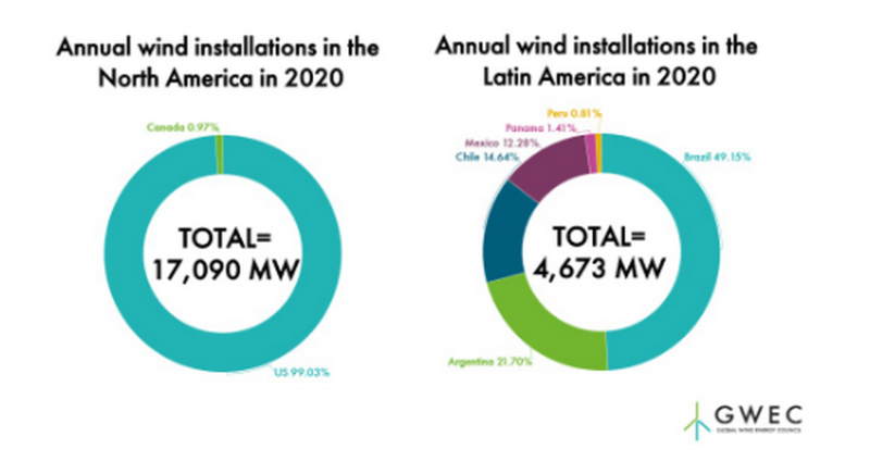根據(jù)全球風能理事會GWEC市場數(shù)據(jù)顯示,2020年,盡管受到COVID-19的影響,是北美和拉丁美洲風電創(chuàng)紀錄的一年。全年新增風電容量約22吉瓦,同比增長62%。