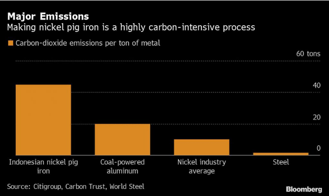 花旗集團(tuán)的一項(xiàng)分析顯示,鎳生鐵生產(chǎn)1噸鎳將產(chǎn)生約45噸二氧化碳排放。相比之下,鋼鐵每生產(chǎn)一噸金屬平均需要排放2噸二氧化碳,而鋁在使用煤炭時(shí)則需要排放20噸二氧化碳。