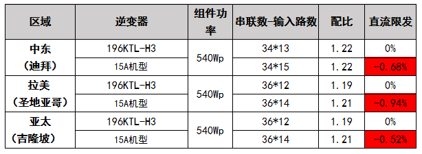 由以上仿真結(jié)果可知,20A機(jī)型(196KTL-H3)逆變器在各區(qū)域都不會產(chǎn)生任何限發(fā),而另一種對比機(jī)型逆變器在不同區(qū)域均存在不同程度的限發(fā)損失。特別需要說明的是,以上仿真按照所有組件均勻輻照考慮,實際工作中各個MPPT的功率并不平均,因逆變器MPPT組串電流通道不夠大導(dǎo)致的限發(fā)情況會更加嚴(yán)重,1%的發(fā)電損失等效CAPEX損失4分/W,為業(yè)主帶來顯著經(jīng)濟(jì)損失。