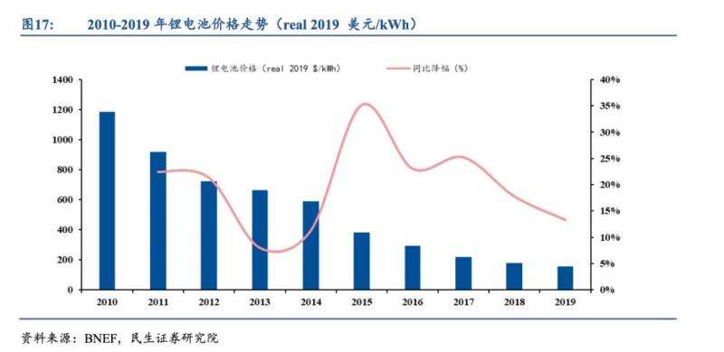 鋰電池也符合這個定律:電池產(chǎn)量每次翻倍,其成本會下降28%[12]。
