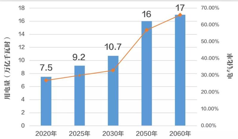 ▲2020-2060年用電量和電氣化率 (數(shù)據(jù)來(lái)源:《中國(guó)2060年前碳中和研究報(bào)告》)