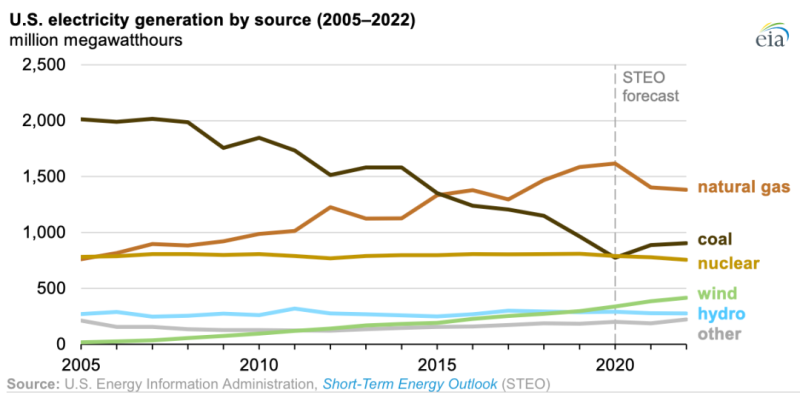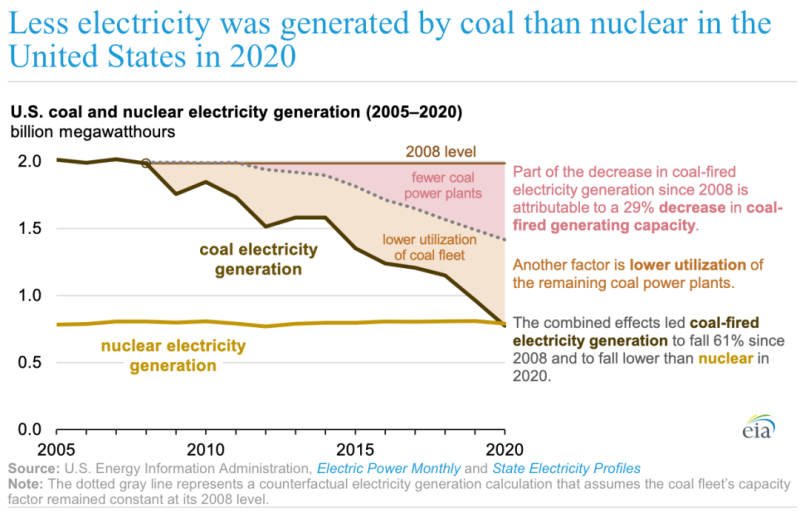 根據(jù)美國能源信息署(EIA)的數(shù)據(jù),2020年美國燃煤發(fā)電總量為7740億千瓦時,低于天然氣發(fā)電(16000億千瓦時)和核能發(fā)電(7900億千瓦時)。這是自1949年以來,煤炭廠首次不是美國最大或第二大的發(fā)電來源。但是,EIA預(yù)計2021年和2022年,美國燃煤發(fā)電量將增加,核電發(fā)電量將減少。