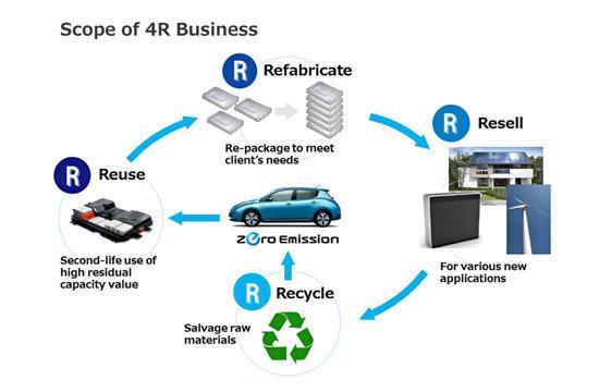 2010年,日產(chǎn)汽車與住友商事株式會社(Sumitomo Corp.)成立合資企業(yè)4R Energy株式會社(4R Energy Corp.),專注于電動汽車電池的有效再利用,并通過開發(fā)技術(shù)和基礎(chǔ)設(shè)施,以4R模式(再制造(refabricate),再循環(huán)(recycle),再銷售(resell)和再利用(reuse)),發(fā)掘車載電池能量價(jià)值為其他設(shè)施提供電力。