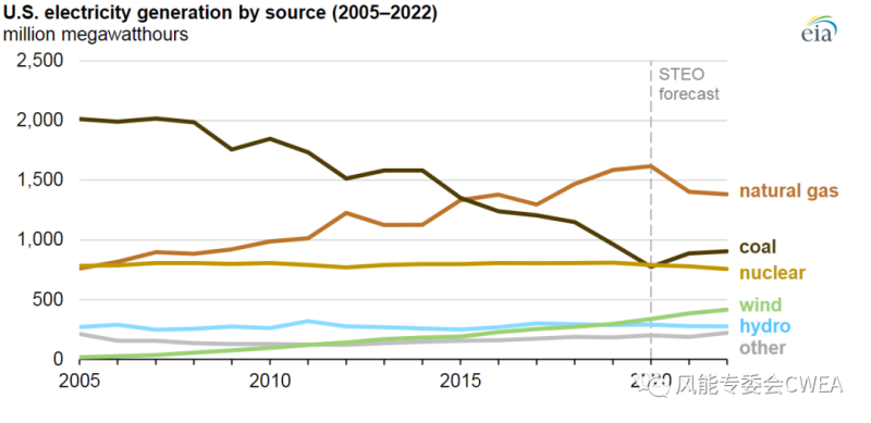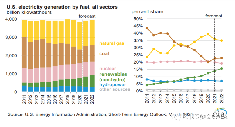 如果將風(fēng)力發(fā)電、太陽能發(fā)電和水電合并到一起,可再生能源的發(fā)電量也已經(jīng)超過了煤電。但美國天然氣發(fā)電仍然處于領(lǐng)先地位。EIA展望報(bào)告顯示,到2050年,美國可再生能源發(fā)電占比將提升到42%,超過天然氣發(fā)電。CWEA