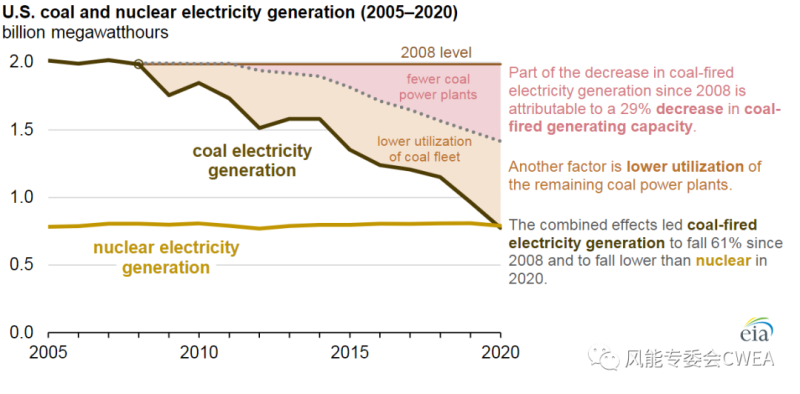 3月18日,美國能源信息署(EIA)發(fā)布的美國最新發(fā)電數(shù)據(jù)顯示,2020年美國燃煤發(fā)電總量為7740億千瓦時(shí),低于天然氣發(fā)電(16000億千瓦時(shí))和核電發(fā)電量(7900億千瓦時(shí))。這是自1949年以來,煤電首次掉出前2名。但EIA也預(yù)計(jì),2021年和2022年美國的燃煤發(fā)電量將增加,而核電發(fā)電量將減少。