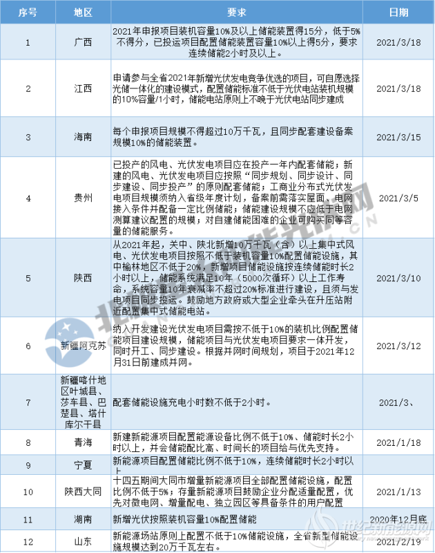 配置儲(chǔ)能已成為“十四五”期間建設(shè)光伏項(xiàng)目的必選項(xiàng)。據(jù)北極星太陽(yáng)能光伏網(wǎng)統(tǒng)計(jì),截至目前全國(guó)約20個(gè)地區(qū)出臺(tái)了光伏+儲(chǔ)能相關(guān)政策。2021開(kāi)年以來(lái),已有廣西、江西、貴州、山東、海南等12個(gè)地區(qū)要求新能源項(xiàng)目強(qiáng)配儲(chǔ)能,比例在5%~10%之間,連續(xù)儲(chǔ)能在2小時(shí)及以上。