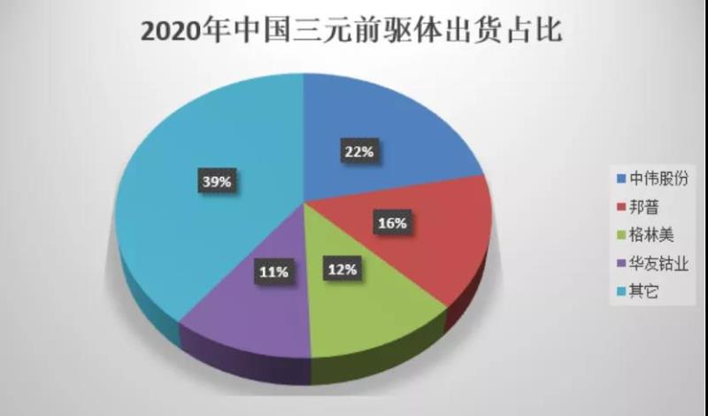 從市場競爭格局來看,2020年國內(nèi)三元前驅(qū)體出貨量TOP4企業(yè)排名,從2019年的格林美、中偉股份、邦普、華友鈷業(yè)變成中偉股份、邦普、格林美、華友鈷業(yè)。