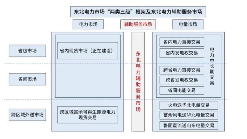 ▲圖一:東北電力市場(chǎng)“兩類三級(jí)”框架及東北電力輔助服務(wù)市場(chǎng)