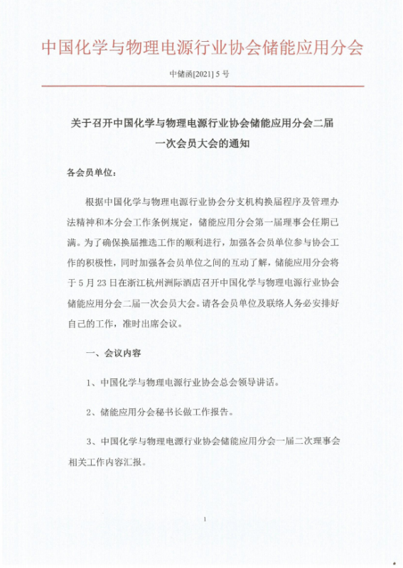 關(guān)于召開中國化學(xué)與物理電源行業(yè)協(xié)會儲能應(yīng)用分會二屆一次會員大會的通知