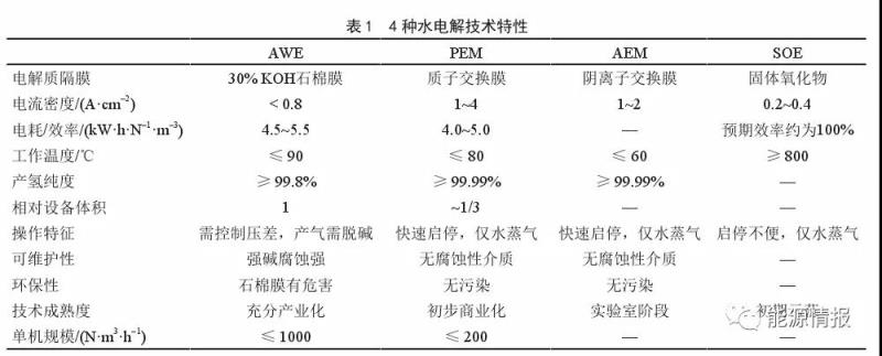 在技術(shù)層面,電解水制氫主要分為 AWE、固體聚合物 PEM 水電解,固體聚合物陰離子交換膜(AEM)水電解、固體氧化物(SOE)水電解,相關(guān)特性對比見表 1。其中,AWE 是最早工業(yè)化的水電解技術(shù),已有數(shù)十年的應(yīng)用經(jīng)驗(yàn),最為成熟;PEM 電解水技術(shù)近年來產(chǎn)業(yè)化發(fā)展迅速,SOE 水電解技術(shù)處于初步示范階段,而 AEM 水電解研究剛起步。從時(shí)間尺度上看,AWE 技術(shù)在解決近期可再生能源的消納方面易于快速部署和應(yīng)用;但從技術(shù)角度看,PEM 電解水技術(shù)的電流密度高、電解槽體積小、運(yùn)行靈活、利于快速變載,與風(fēng)電、光伏(發(fā)電的波動性和隨機(jī)性較大)具有良好的匹配性。隨著 PEM 電解槽的推廣應(yīng)用,其成本有望快速下降,必然是未來 5~10 a 的發(fā)展趨勢。SOE、AEM 水電解的發(fā)展則取決于相關(guān)材料技術(shù)的突破情況。
