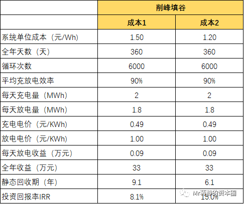 這里同樣以1MW/2MWh的儲能系統(tǒng)為例,假設(shè)充電電價(jià)為0.49元/KWh,放電電價(jià)為1.0元/KWh。在單位系統(tǒng)成本1.5元/Wh的情況下,投資回收期為9.1年,全生命周期的IRR為8.1%。如果單位系統(tǒng)成本下降至1.2元/Wh,投資回收期為6.1年,全生命周期的IRR為15%,將具備一定的經(jīng)濟(jì)性。
