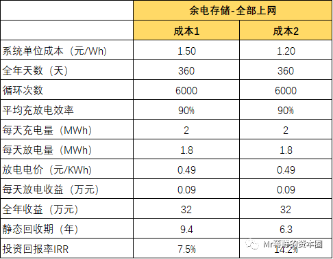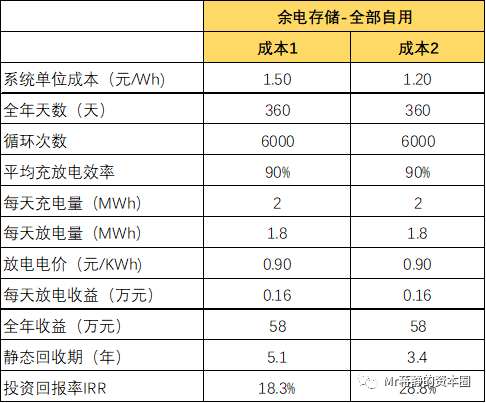 同樣以1MW/2MWh的儲能系統(tǒng)為例,假設(shè)系統(tǒng)單位成本為1.5元/Wh,系統(tǒng)總成本為300萬元。余電存儲之后,自存自用,假設(shè)電價(jià)為0.9元/KWh,投資回收期為5.1年,全生命周期的IRR為18.3%,經(jīng)濟(jì)性較好。如果系統(tǒng)成本更低,或者社會電價(jià)更越高,經(jīng)濟(jì)性會更好。