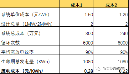 以1MW/2MWh的儲能裝機(jī)進(jìn)行測算,采用比較匹配新能源發(fā)電側(cè)儲能的方形磷酸鐵鋰,目前系統(tǒng)單位成本約1.5元/Wh,系統(tǒng)總成本約為300萬元,目前具有競爭力的循環(huán)次數(shù)可以達(dá)到6000次,平均效率90%。